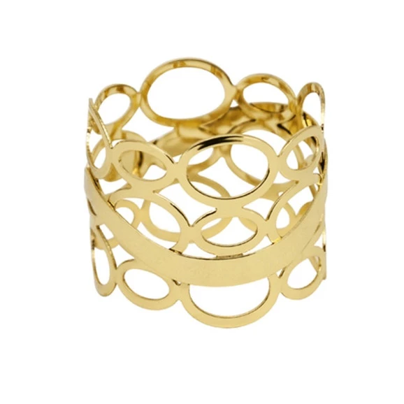 Anel de Guardanapo em aço carbono dourado, material durável e resistente. Ajudando a compor a mesa, o produto acrescenta charme e elegância às refeições. Orientações Gerais: 1. Não recomendado ir à máquina de lavar louça. 2. Utilizar na higiene sabão neutro e água. 3. Não pode ir ao microondas.