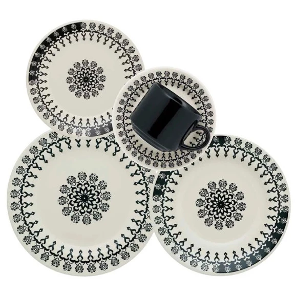 A cor preta é básica e neutra, um verdadeiro curinga na hora de montar a mesa. Nessa louça, colocamos a cor preta numa estampa mais alegre e jovial, perfeita para quem prefere um formato de pratos tradicional com uma decoração mais alegre. A xícara preta, sem decoração, cria uma linda composição com as demais peças.