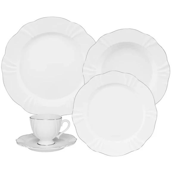 As formas clássicas que nunca saem de moda ganham uma releitura moderna e sofisticada no aparelho de jantar Soleil Katherine da Oxford. A louça branca é enfeitada com delicados filetes prateados, o que cria uma composição discreta e elegante. A louça ideal para quem quer uma mesa mais nobre e formal.