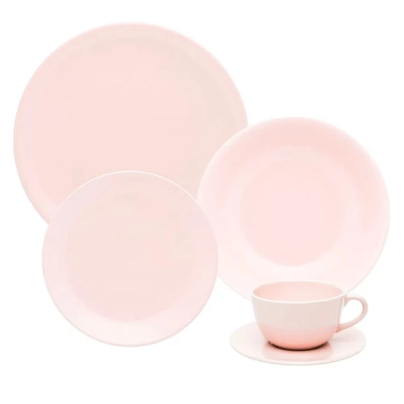 06 Pratos Rasos - 26cm; 06 Pratos Fundos - 20cm; 06 Pratos de Sobremesas - 19cm; 06 Pires de Chá - 14cm; 06 Xícaras de Chá - 200ml.