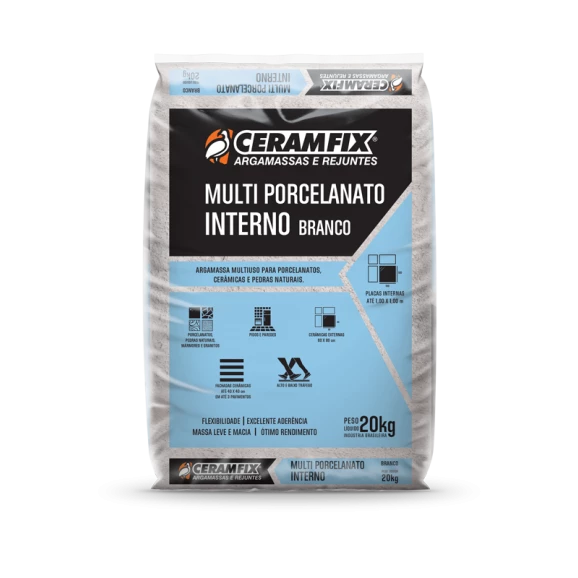 A Multi Porcelanato Interno é uma argamassa colante especial para assentamento de peças cerâmicas tipo porcelanato em áreas internas. Indicada também para assentamento de pedras naturais, mármores e granitos. É produzida com matérias-primas selecionadas, garante excelente aderência e resistência mecânica, além de oferecer uma massa leve, macia e de ótimo rendimento.