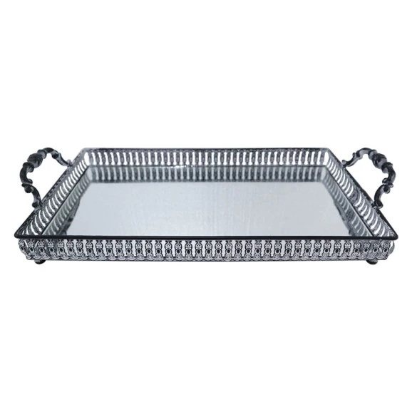 Descrição As bandejas complementam a decoração de ambientes, utilizadas em aparadores e mesas de centro deixam o espaço ainda mais elegante agregando com objetos decorativos. Especificações Complementares: Marca: L’hermitage Referência: 26863 Modelo: 26863 Linha: Dahab Ean: 7893220269417 Cor: Prata Material: Espelho e Alça de Ferro Medidas do Produto- cm (LxCxA): 41.5x22x8.5Cm Peso: 1,139Kg Garantia: 3 meses