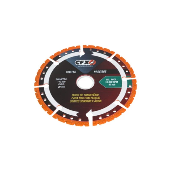 Disco feito de tungstênio, com específico design nas lâminas que pode ser utilizado para cortes em diversos materiais como: porcelanatos, cimentícios, madeiras, metais diversos e afins.