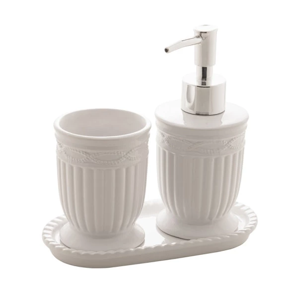 Transforme seu banheiro em um ambiente de requinte com o Conjunto Lyor 3 Peças de Cerâmica Greece. Este elegante kit, na combinação sofisticada de branco e prateado, é perfeito para organizar e decorar seu espaço com estilo. As peças são feitas em cerâmica de alta qualidade, garantindo durabilidade e um acabamento impecável que remete à clássica beleza grega. Ideal para quem busca um toque de luxo e funcionalidade para o dia a dia.