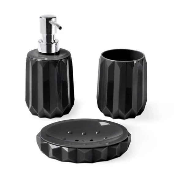 Descrição. Com design de linhas retas, que lembram dobraduras, a linha Fold apresenta acessórios que proporcionam praticidade e organização do ambiente. Elaborada em plástico AS na cor preta, o conjunto é composto por porta-sabonete líquido, porta-sabonete em barra e porta-escovas de dente. Além disso, é de fácil higienização, oferecendo elegância e funcionalidade para banheiros e lavabos.
