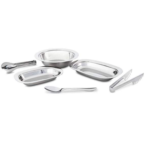 Capriche na receita e também na apresentação dos seus pratos. O conjunto para servir de 06 peças da linha Lyon é multiuso e pode levar os mais diferentes pratos à sua mesa, todos com muito estilo. O kit chama atenção pela praticidade e funcionalidade. Além disso, os produtos da linha Lyon são feitos em aço inoxidável, o que lhes garante resistência e durabilidade, e podem ir à máquina de lavar louça sem problemas. Composição: 1 Travessa Retangular 30x20x6,2cm 1 Travessa Retangular 25x17x6,2cm 1 Travessa Redonda Ø28x8cm 1 Colher para Arroz 25cm 1 Pegador para Massa 20,5cm 1 Pegador para Salada 20,5cm