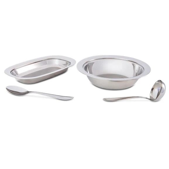Conteúdo: 4 peças - 1 Travessa Retangular 35x24x6,2cm / 1 Travessa Redonda Ø28x8cm / 1 Colher para Arroz 25cm / 1 Concha para Feijão 21cm -