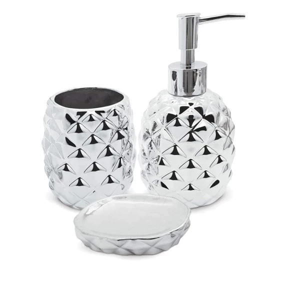 DescriçãoOs artigos com design que remete ao Abacaxi estão super em alta, e este conjunto é a aposta certa para levar mais beleza e praticidade ao seu banheiro. Composto por 03 peças fabricadas em cerâmica resistente e de alta durabilidade para decorar e organizar seu banheiro em grande estilo. Especificações Complementares: Marca: Mimo Style Referência: 41954 Modelo: BH1780P Linha: Decoração Ean: 7898618043525 Cor: Prata Material: Cerâmica Medidas do Produto- cm (LxCxA): 20x20x9Cm Peso: 0,827KG Garantia: 3 Meses