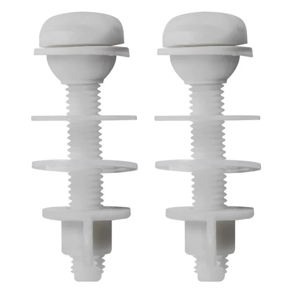Conjunto de fixação da caixa acoplada na bacia sanitária. São dois parafusos que se encaixam entre a louça e a caixa acoplada com a finalidade de fixá-las, garantindo sua sustentação e vedação. Parafusos fabricados em plásticos de alta resistência e vedação.
