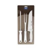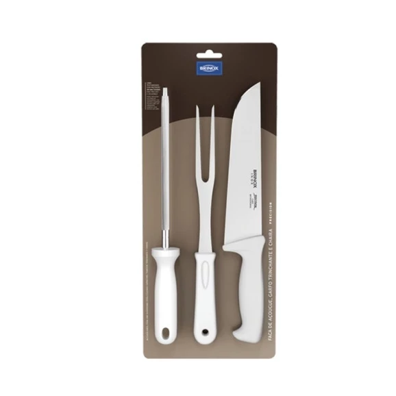 Descrição Seus momentos ao redor do fogo e da churrasqueira ficam ainda mais incríveis com o Kit Churrasco Brinox 3 peças - faca, garfo trinchante e chaira com lâmina em aço inoxidável e cabo branco - Linha Precision. O conjunto básico é perfeito para cortar e servir carnes nos seus churrascos de família e nos grandes eventos. Possui lâmina em aço inoxidável temperado e revenido, o que garante segurança e durabilidade as suas facas e utensílios. Seus cabos em polipropileno texturizado com proteção antibacteriana e proteção para os dedos, não deixam você na mão. Além de ser perfeito para uso em açougues e cozinhas industriais é indicado para o preparo de carnes na cozinha e churrasqueira da sua casa.
