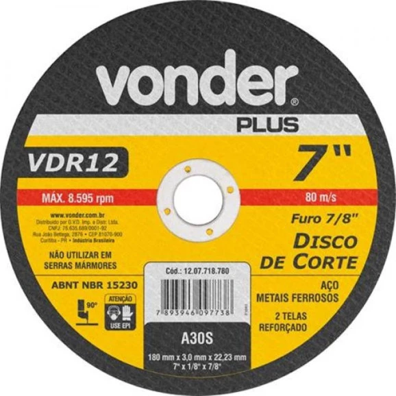 Descrição: O disco de corte vonder 177,8x3,0x22,22 VDR12 plus possui excelente performance em trabalhos contínuos. Indicado para cortes de aços e materiais ferrosos (barras, tubos e chapas). Com estrutura reforçada, é ideal para uso industrial. Não utilizar em serra mármore.