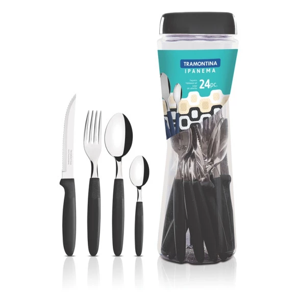 Especificações complementaresConteúdo: 24 peças - 6 Colheres de mesa / 6 Colheres para chá / 6 Facas para churrasco 5" / 6 Garfos de mesa
