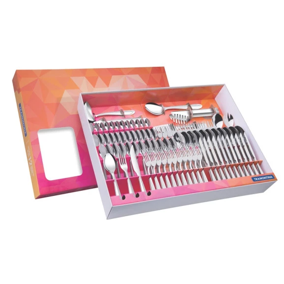 Conteúdo: 91 peças - 1 Colher para arroz / 1 Concha para feijão / 1 Garfo trinchante / 1 Pegador para massa / 1 Pá para bolo / 2 Talheres para salada / 12 Colheres de mesa / 12 Colheres médias / 12 Colheres para café / 12 Colheres para chá / 12 Facas para churrasco / 12 Garfos de mesa / 12 Garfos para torta -