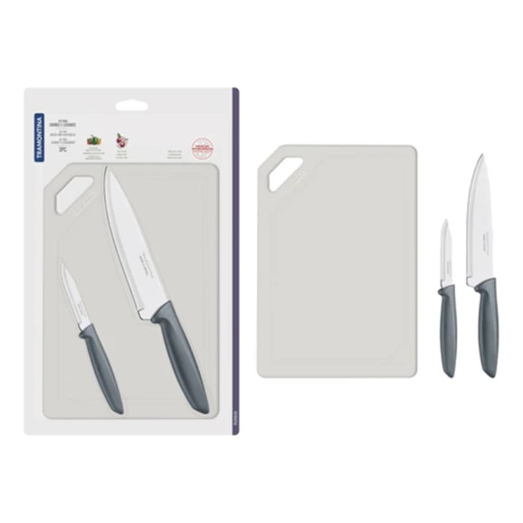 Descrição Facas práticas e de qualidade são essenciais na nossa cozinha. Com o Kit para Carnes e Legumes Tramontina Plenus com Lâminas em Aço Inox Cabos de Polipropileno Cinza e Tábua para Cortar 3 Peças da Linha Plenus você vai encontrar peças que atendem aos diferentes usos. Estão presentes nas principais refeições, as três peças cumprem o papel na cozinha. Ideal para cortar carnes e legumes, podem ser levadas à máquina de lavar louças. Produzidas com cabos em polipropileno cinza e lâmina em aço inox e tábua em polipropileno, são resistentes e fáceis de manusear.