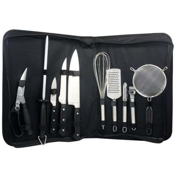 Composição:- 1 Faca do Chef - 8 polegadas;- 1 Faca para desossar - 6 polegadas;- 1 Faca para legumes - 3 polegadas;- 1 Tesoura trinchante - 8 polegadas;- 1 Chaira - 8 polegadas;- 1 Batedor de ovos - 12 polegadas;- 1 Ralador de queijo;- 1 Peneira;- 1 Descascador de limão;- 1 Bolsa