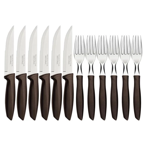 Deseja compor uma mesa diferenciada e ainda mais bonita para comer aquele churrasco especial com seus amigos e família? Para isso, conte com o jogo para churrasco jumbo tramontina plenus com lâminas em aço inox e cabos de polipropileno marrom 12 peças. Na cor marrom, os talheres do jogo tem cabo em polipropileno, o que garante maior durabilidade e um manuseio mais confortável. As lâminas são produzidas em aço inox e devido ao tratamento térmico, as facas tem alto poder de corte e maior resistência, devido a estampagem e espessura. Além de todas essas características, os talheres podem ir à máquina de lavar louças e vão otimizar seu dia a dia e suas tarefas na cozinha!