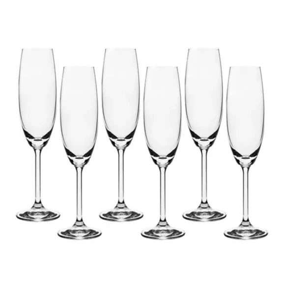 Descrição O Jogo de 6 taças para champanhe Anna Transparente em cristal ecológico 220 ml Bohemia feito em Cristal Titânio, além de não conter chumbo, é mais resistente à impacto quando comparado ao cristal comum. Belas e charmosas essas taças darão um charme especial à sua mesa. Especificações Complementares: Marca: Bohemia Referência: 58002 Modelo: 58002 Linha: Anna Ean: 8593401755706 Cor: Transparente Material: Cristal Ecológico Medidas do Produto- cm (LxCxA): 14x20,5x22,5Cm Peso: 1,070Kg Capacidade: 220Ml Garantia: 3 meses