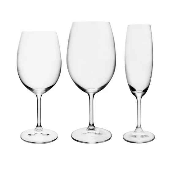 Conjunto composto por 18 taças fabricadas em cristal ecológico, matéria prima livre de chumbo e que não é prejudicial ao meio ambiente. Apresenta alta resistência, o brilho característico dos cristais e ótimo acabamento.