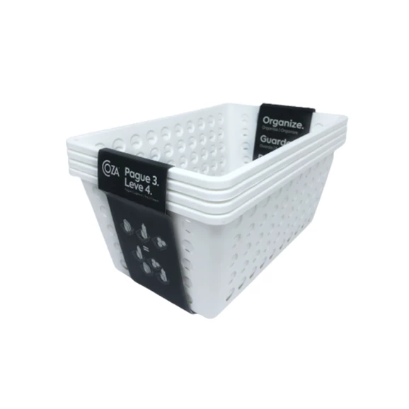 Descrição. Práticas e versáteis, as cestas organizadoras podem ser usadas em qualquer parte da casa. Práticas para armazenar e organizar os mais diferentes objetos em qualquer ambiente, as cestas têm um design que mostra tudo o que está dentro dela, facilitando na hora de procurar o que está guardado. - Plástico Durável e Resistente - Reciclável - Fácil de Limpar Especificações Complementares: Marca: Brinox Referência: 99250/4331 Modelo: 99250/4331 Linha: Coza Ean: 7896553986693 Cor: Branco Material: Polipropileno Medidas do Produto- cm (LxCxA): 19,1x28,8x12,3Cm Peso: 0,682Kg Garantia: 3 Meses