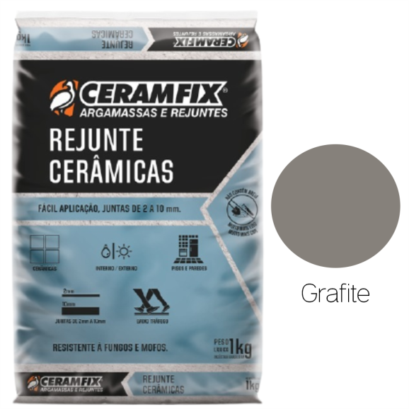 Marca Ceramfix Modelo Rejunte Linha Cerâmicas Ean 7898449130319 Código Identificador (SKU) 8995 Cor Grafite Material Cimento Portland, Calcário Dolomítico e Aditivos Medidas do Produto - cm (LxCxA) 16x22x3cm Peso Bruto (Kg) 1kg Tempo de Garantia (meses) 18
