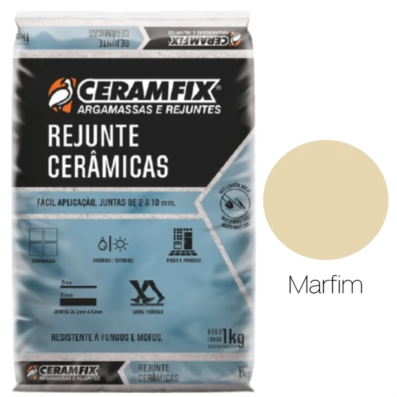Marca Ceramfix Modelo Rejunte Linha Cerâmicas Ean 7898449130326 Código Identificador (SKU) 2521 Cor Bege Material Cimento Portland, Calcário Dolomítico e Aditivos Medidas do Produto - cm (LxCxA) 16x22x3cm Peso Bruto (Kg) 1kg Tempo de Garantia (meses) 18