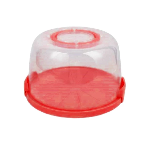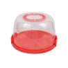 Porta bolo com tampa e alça produzido em plástico transparente e detalhes em vermelho. Esta peça além de proteger seu alimento ainda decora o ambiente.