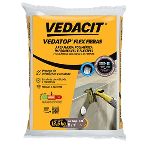 Descrição VEDACIT VEDATOP FLEX é uma argamassa polimérica, flexível, termoplástica indicada para vedar e eliminar vazamentos e umidade. Adere perfeitamente a concreto, alvenaria e argamassa, acompanhando eventuais movimentações. Por isso, é especialmente indicada para impermeabilizar estruturas sujeitas a deformações.